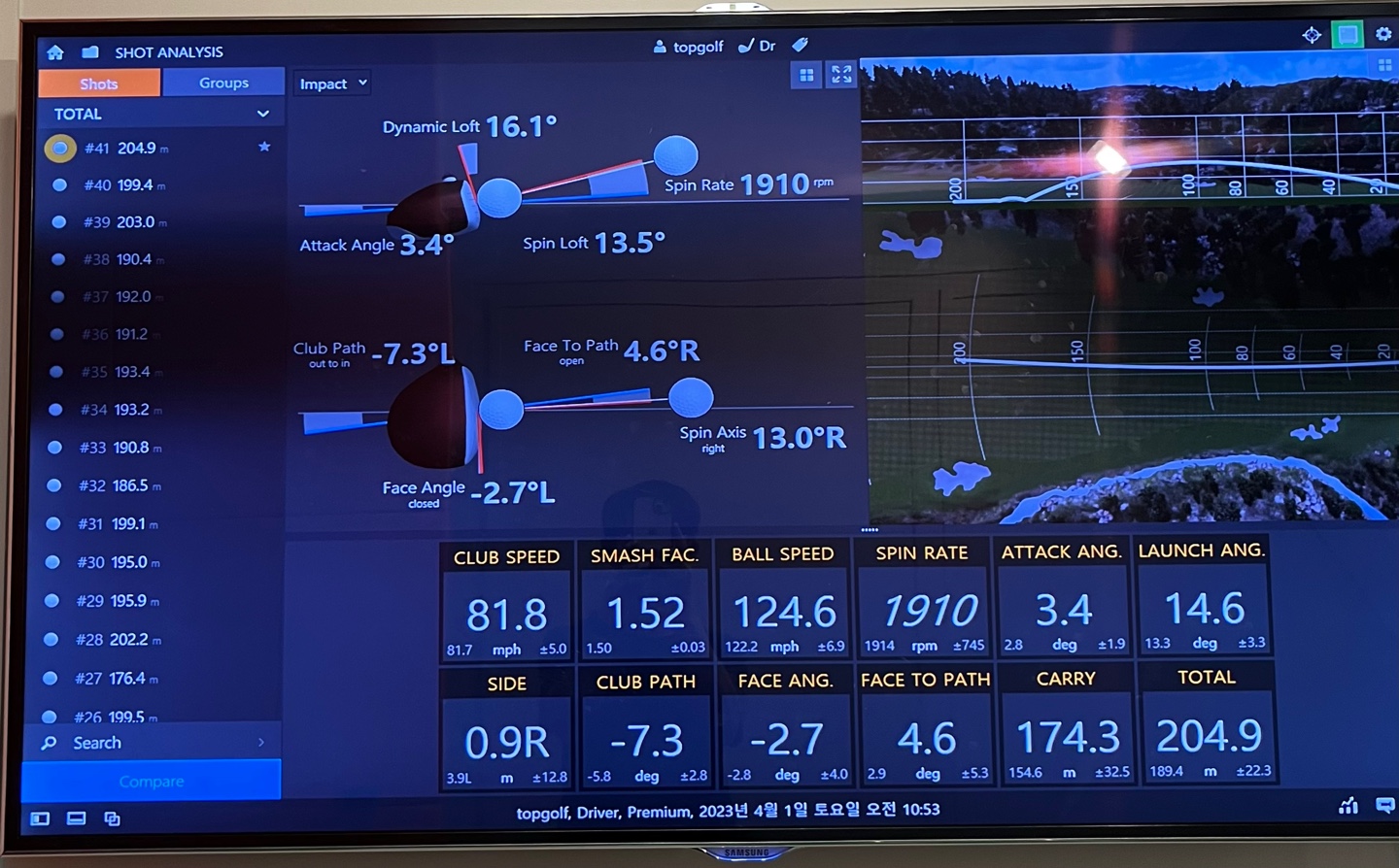 그래서 패러다임 드라이버 스탁 SR을 쳐보게 됐는데, 한 40개 정도 때려보고 나니 피터분이 백스핀은 문제가 없으시다고 하시네요??. 트랙맨 데이터를 보니 백스핀은 1천 후반~2천 초반이 안정적으로 나오더라구요. 결국 로우스핀 모델을 그렇게 알아볼 필요가 없었단 이야기죠. 역시 시타가 답인가 봅니다. 볼스 124mph(약 55m/s)에 비거리 205m 가 나오는 걸 보니 오잉? 살까.. 하는 생각이 드는 걸 간신히 누르고 나왔습니다.ㅎㅎ