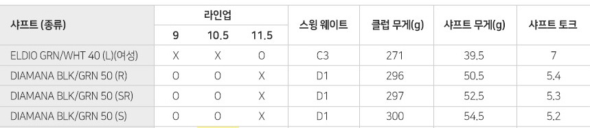 그리고 국내 에픽 맥스 드라이버 DIAMANA S샤프트 스펙입니다.