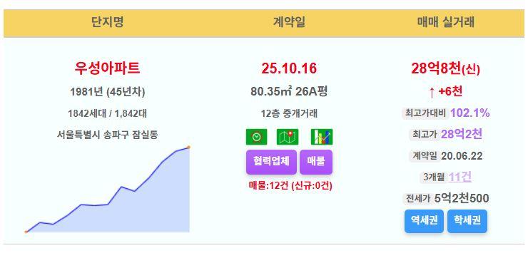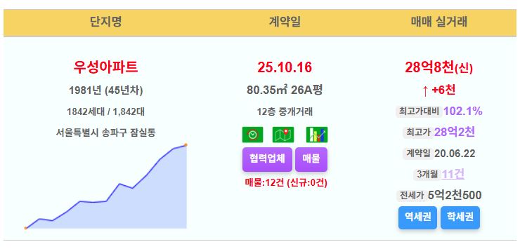 송파구 우성 26평 28.8억 신고가