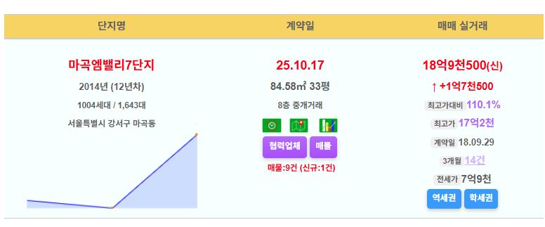 강서구 마곡엠밸리7단지 33평 18.95억 신고가