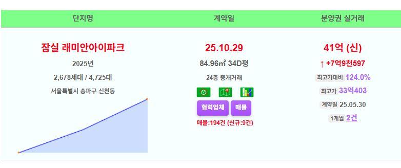 송파구 잠실래미안아이파크 34평 41억 신고가