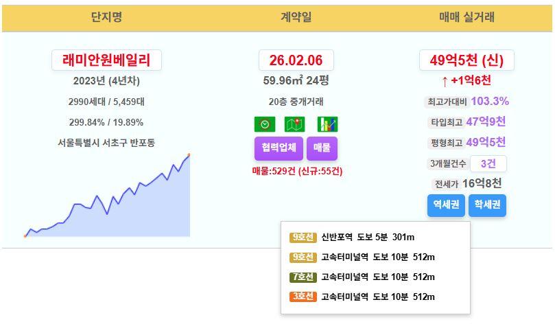 래미안원베일리 24평 49.5억 신고가~!!