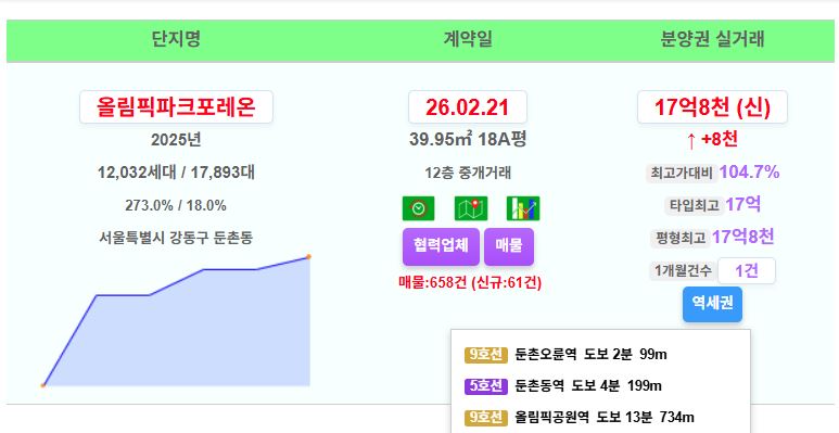 강동구 올림픽파크포레온 18평 17.8억 신고가~!!