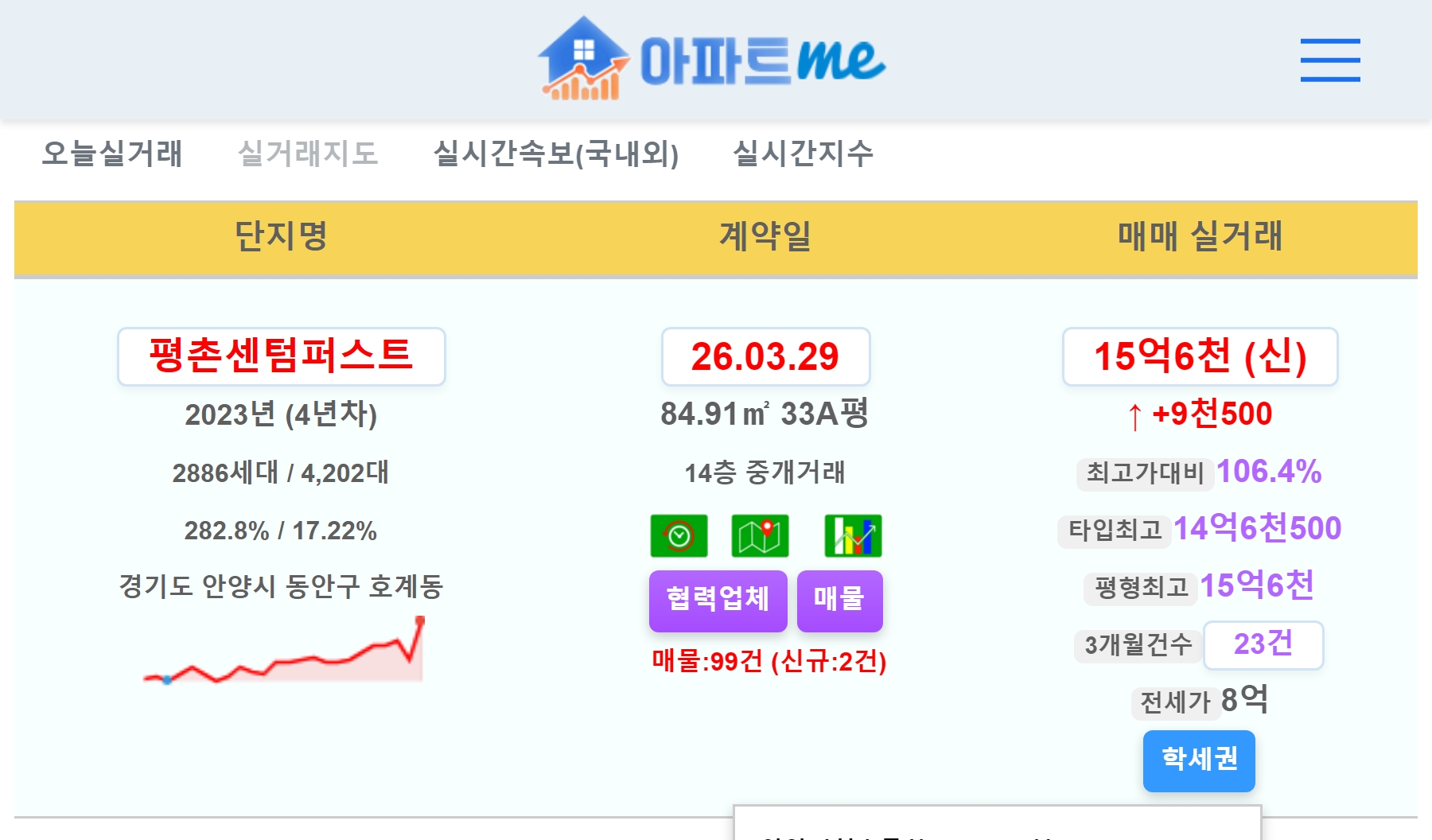 안양시 동안구 평촌센텀퍼스트 15.6억 신고가~!!