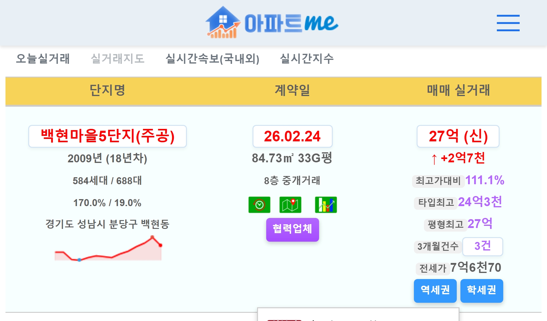 성남시 분당구 백현마을5단지(주공) 27억 신고가~!!
