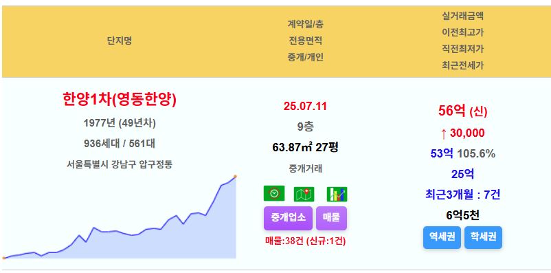 강남구 한양1차(영동한양) 27평 56억 신고가