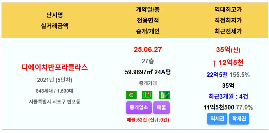 서초구 디에이치반포라클라스 24평 35억 신고가