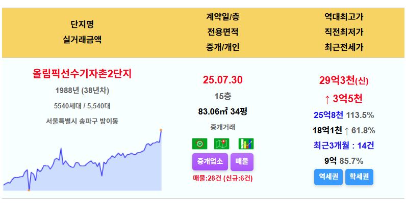 송파구 올림픽선수기자촌2단지 34평 29.3억 신고가