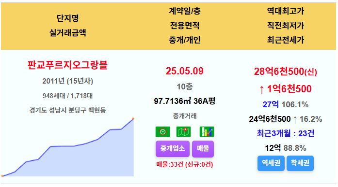 판교푸르지오그랑블 36평 28.65억 분당 국평(?) 돌파