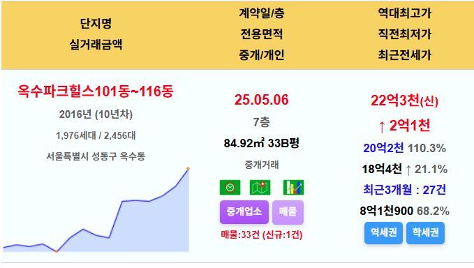 성동구 옥수파크힐스 33평 22.3억 신고가