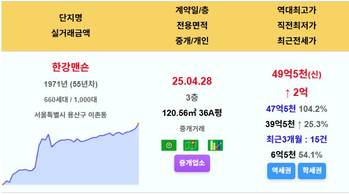 용산구 한강맨숀 36평 49.5억 신고가