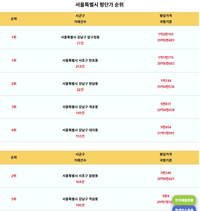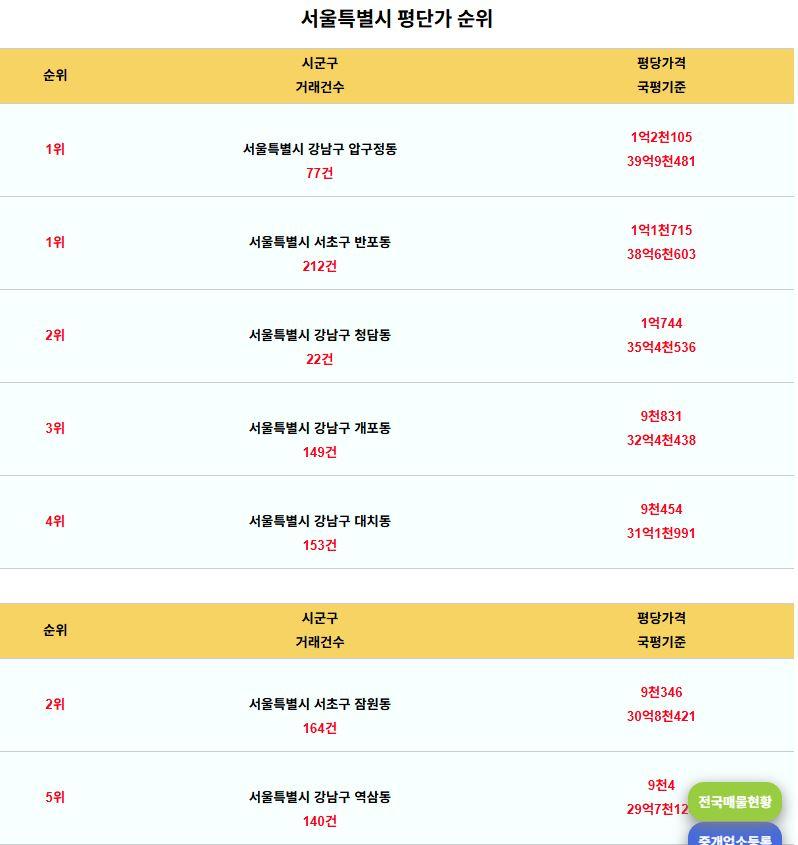 동별 평단가 순위 - 1위:압구정동 2위:반포동 3위:청담동 4위:개포동 5위:대치동 6위:잠원동 7위:역삼동 8위:도곡동 9위:삼성동 10위:일원동 등