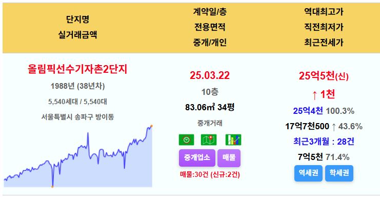 송파구 올림픽선수기자촌 34평 25.5억 신고가