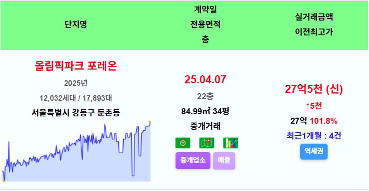 올림픽파크포레온 국평 27.5억 신고가~