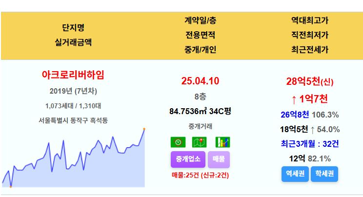 아크로리버하임 34평 28.5억 신고가 동작구 국평돌파