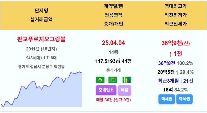 판교푸르지오그랑블 44평 36.9억 신고가