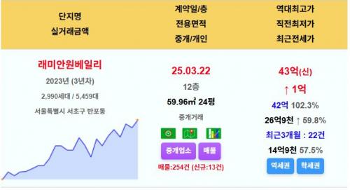 서초구 래미안원베일리 24평 43억 신고가