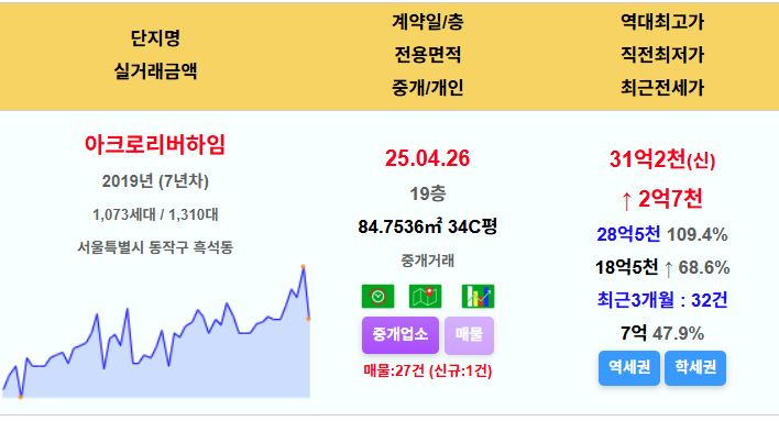 아크로리버하임 34평 31.2억 신고가 동작구 국평 최고가 돌파