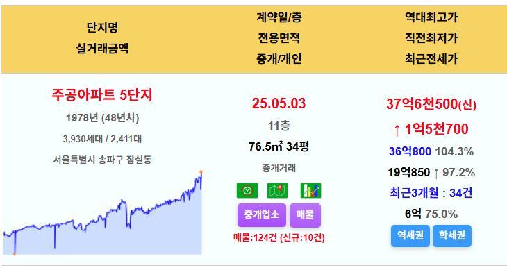 송파구 잠실주공5단지 34평 37.65억 신고가