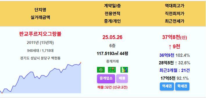 분당구 판교푸르지오그랑블 44평 37.8억 신고가