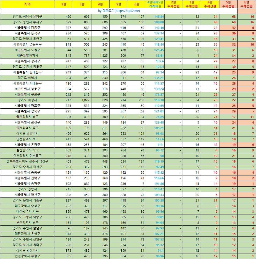 기존흐름이 바뀌는 실거래흐름에 대한 자료  이미 상승세가 강한 지역은 의미가 적음