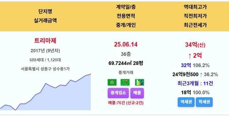 성동구 트리마제 28평 34억 신고가