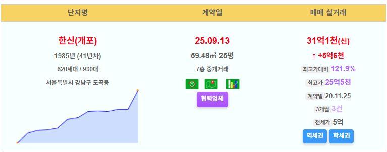 강남구 한신(개포) 25평 31.1억 신고가