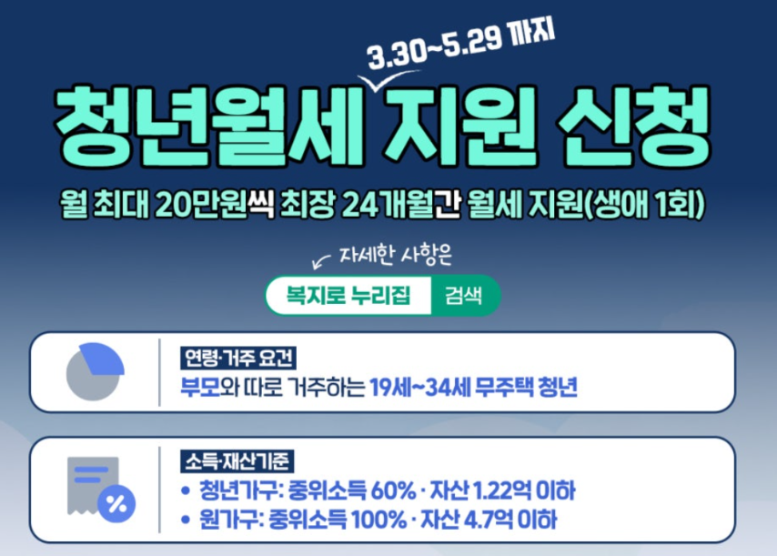 정부에서 청년층의 주거비 부담 경감을 위해 실제 납부하는 임대료를 **월 최대 20만 원(최대 24회, 총 480만 원)**까지 현금으로 지원하는 사업입니다. 생애 1회에 한해 지원됩니다.