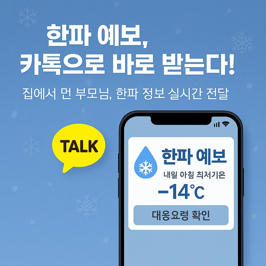겨울마다 부모님이나 아이들 걱정 많이 되시나요? 한파 영향예보 직접전달 서비스 신청해 두시면, 내 가족이 사는 지역에 한파가 예보될 때마다 낮 12시쯤 카카오톡으로 위험정보와 대응요령을 직접 받아보실 수 있어요.