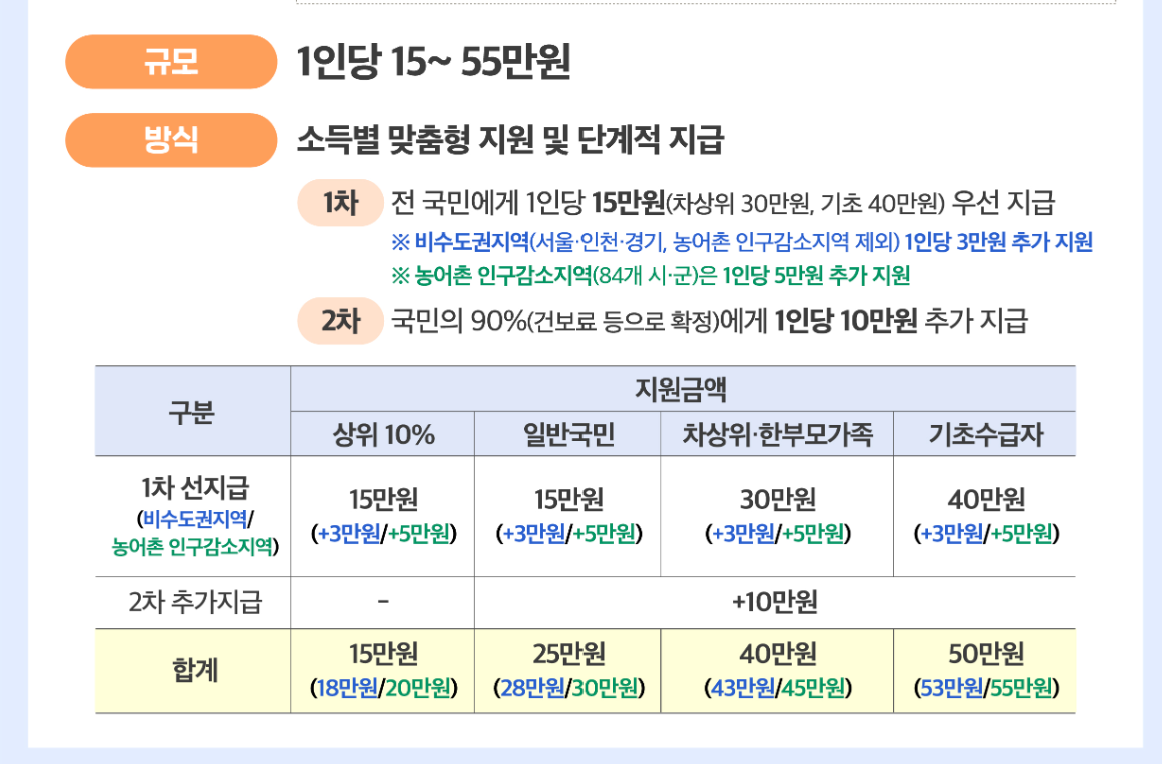 - 전체 국민 중 소득 상위 10% 제외, 약 90% 대상에게 지급