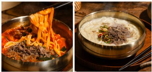 직접 반죽해 만든 자가제면 면발과 한우 사골로 우려낸 국물이에요.