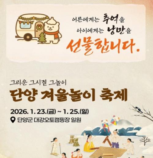 충청북도 단양에서 처음 개최된 겨울 체험형 축제로, 전통 놀이와 겨울 액티비티를 함께 즐길 수 있어 많은 관심을 받았습니다.