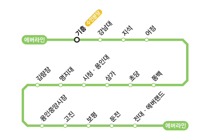 에버라인 노선도는 수도권 전철 네트워크와 연결되는 경기도 용인시의 핵심 경전철 노선입니다. 이 에버라인 노선도는 용인시의 주요 주거 지역과 관광 명소를 연결하며, 수인분당선과의 환승을 통해 서울 강남 및 수원, 분당 방면으로의 접근성을 제공하는 지역 맞춤형 교통 시스템입니다. 에버라인 노선도는 용인경량전철(주)가 운영하며, 무인 자동 운전 시스템으로 운영되는 것이 특징입니다. 에버라인 노선도의 색상은 밝은 연두색(Light Green Line) 계열로, 용인시의 핵심 교통망을 담당하고 있습니다.