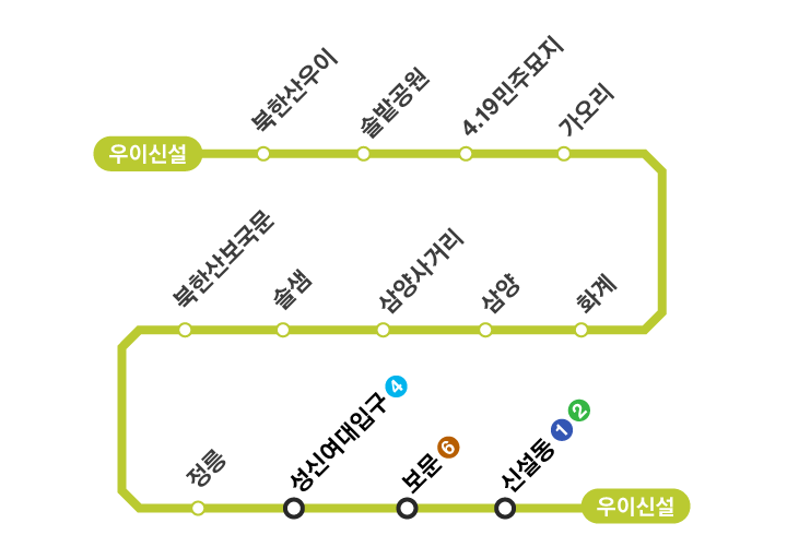 우이신설선 노선도의 핵심 환승 거점은 성신여대입구역입니다. 성신여대입구역에서는 4호선과의 환승이 가능하여, 우이신설선 노선도를 이용하는 주민들이 4호선을 통해 서울 도심(명동, 동대문), 서울역, 그리고 경기 남부(과천, 안산) 방면으로의 광역 접근성을 확보하는 관문 역할을 합니다. 이 환승 연계 덕분에 우이신설선은 단순한 지역 내 교통수단을 넘어 수도권 광역 전철망의 일원으로서 기능하게 됩니다.