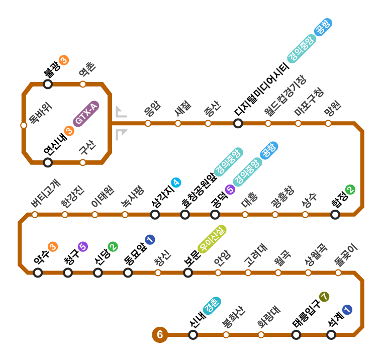 서울 지하철 6호선 노선도는 수도권 전철 네트워크에서 서울의 북부와 동부 외곽 지역을 연결하며, 기존의 남북 및 동서 주요 노선들을 보조하는 순환 및 연계 노선의 역할을 수행합니다. 이 서울 지하철 6호선 노선도는 **서울교통공사(SMRT)**가 전 구간을 운영하며, 서울 서북부의 응암역에서 시작하여 서울 내부를 반원형으로 크게 돌아 동부의 신내역까지 연결되는 노선입니다. 서울 지하철 6호선 노선도의 색상은 밝은 갈색(Brown Line) 계열이며, 마포구, 용산구, 성북구, 노원구 등 서울의 다양한 주거 및 문화 중심지를 관통하며 교통의 편의성을 높이는 중요한 보조 축 역할을 담당합니다.