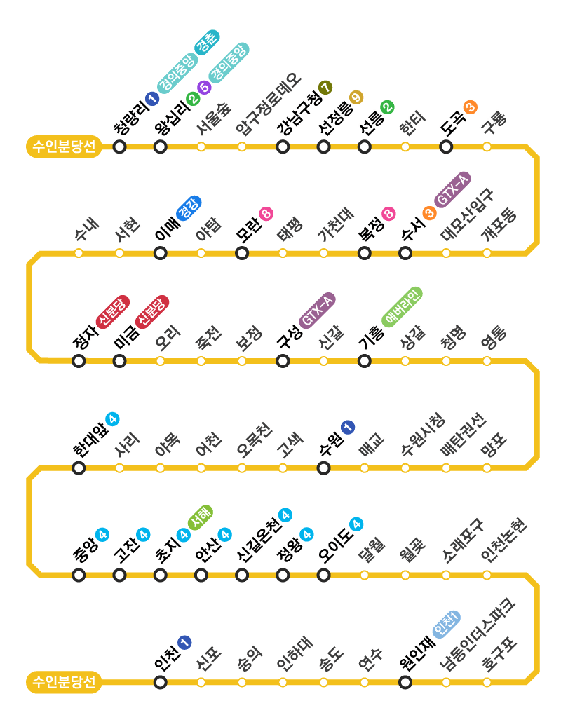 서울 지하철 수인분당선 노선도는 수도권 전철 네트워크에서 인천광역시 송도를 시작으로 경기도 수원, 용인, 성남 분당을 거쳐 서울의 강남 핵심 지역을 지나 청량리까지 연결하는 수도권 남북을 잇는 최장거리 광역 종단 노선입니다. 이 수인분당선 노선도는 한국철도공사(코레일)가 전 구간을 운영하며, 기존의 수인선과 분당선이 직결되어 탄생한 노선으로, 경기 남부 지역의 통근 및 광역 교통 수요를 서울 도심으로 유입시키는 최대 교통 동맥 역할을 수행합니다. 수인분당선 노선도의 색상은 밝은 노란색(Yellow Line) 계열이며, 인천, 수원, 분당 등 대규모 주거 및 신도시 지역과 서울 강남을 직접 연결하여 수도권 생활권 통합에 결정적인 기여를 하고 있습니다.