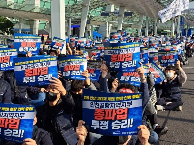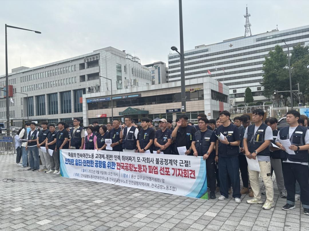 인천, 김포 등 전국 15개 공항 노동자 1만5천명이 모인 전국공항노동자연대가 오는 19일부터 총파업에 들어간다고 밝혔다. 전국공항노동자연대는 9일 오전 용산 대통령실 앞에서 총파업 선포 기자회견을 열었다.