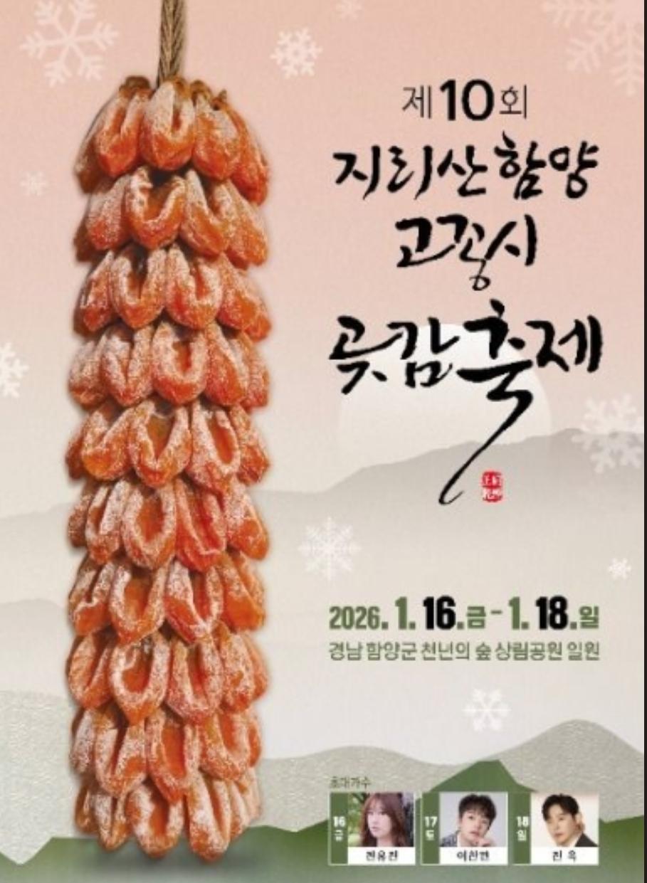 2026 지리산 함양 곶감축제 일정 이찬원 전유진 초대 가수 트로트 공연 무료 관람 체험 프로그램 곶감 만들기 떡 만들기 시식 코너 전통 놀이 포토존 사전 예약 필요 인원 제한 함양군청 홈페이지 신청 가족 어린이 어른 모두 즐김 겨울 축제 추억