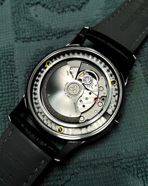 뒷판을 열면 미요타 90s5 무브먼트가 보이는데