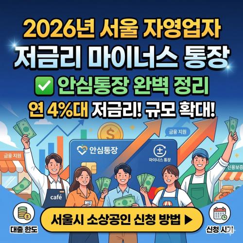 자금이 막혀 하루하루 버티기 힘든 소상공인이라면 지금 이 제도를 반드시 확인해야 합니다. 서울시가 최대 수천만원까지 활용 가능한 ‘자영업자 안심통장’을 다시 확대하면서 신청 경쟁이 매우 치열해질 전망입니다. 신청 조건과 일정, 실제 활용 방법까지 지금 바로 확인해 보세요. 안심통장 바로 신청하기 서울 자영업자 안심통장이란 서울시 안심통장은 자영업자와 소상공인의 자금 부담을 줄이기 위해 만든 금융지원 제도입니다. 일반 대출과 달리 ‘마이너스 통장’ 방식으로 운영되어 필요한 만큼만 사용하고 사용한 기간만큼만 이자를 부담하는 구조가 특징입니다. 자금 회전이 빠른 자영업자에게 특히 유리한 정책 금융 상품입니다. 서울시는 2026년에도 대규모 지원을 이어가며 약 5,000억 원 규모의 자금을 공급할 계획입니다. 그중 상반기에 약 2,000억 원이 먼저 공급되며 약 2만 명의 소상공인이 혜택을 받을 것으로 예상됩니다. 서울시 안심통장 신청 2026년 달라진 지원 혜택 올해 가장 큰 변화는 이용 편의성과 접근성이 크게 높아졌다는 점입니다. 기존에는 일부 은행만 이용할 수 있었지만 이제는 인터넷은행까지 포함되어 다양한 금융기관을 통해 신청할 수 있습니다. 구분 내용 지원 방식 마이너스 통장 방식 운영 예상 금리 약 연 4%대 수준 지원 규모 총 5,000억 원 상반기 공급 약 2,000억 원 협력 은행 신한, 우리, 하나, 카카오뱅크, 케이뱅크, 토스뱅크 특히 카드론이나 고금리 대출을 이용하던 소상공인에게는 큰 도움이 됩니다. 일반 카드론 금리가 14% 이상인 경우가 많은 반면 안심통장은 훨씬 낮은 금리로 이용 가능하기 때문입니다. 안심통장 바로 신청하기 신청 자격 조건 정리 지원 대상은 서울시에 사업장을 둔 소상공인 또는 중소기업 사업자입니다. 일정한 매출 실적과 신용 기준을 충족해야 하며 사업 운영 기간도 중요한 조건 중 하나입니다. 조건 세부 기준 사업장 위치 서울시 소재 사업장 업력 개업 후 1년 이상 매출 기준 최근 3개월 200만원 이상 또는 연 매출 1,000만원 이상 신용 점수 NICE 기준 600점 이상 청년 사업자의 경우 일부 조건이 완화될 수 있습니다. 특히 만 39세 이하 청년 사업자는 기존 대출이 있어도 지원이 가능한 경우가 있어 보다 넓은 지원이 이루어질 예정입니다. 서울시 안심통장 신청 신청 일정과 5부제 일정 신청 초기에는 접속 폭주를 방지하기 위해 출생연도 끝자리 기준 5부제가 운영됩니다. 이후에는 제한 없이 신청이 가능하지만 예산이 빠르게 소진될 수 있어 빠른 신청이 중요합니다. 신청일 출생연도 끝자리 3월 19일 1, 6 3월 20일 2, 7 3월 23일 3, 8 3월 24일 4, 9 3월 25일 5, 0 3월 26일 이후 누구나 신청 가능 신청은 서울신용보증재단 모바일 앱을 통해 진행됩니다. 사업장 위치에서 직접 사진을 촬영해야 하는 절차가 있어 미리 준비해 두는 것이 좋습니다. 신청 전 준비해야 할 것 신청 과정은 대부분 비대면으로 진행되지만 몇 가지 준비물이 필요합니다. 서류 준비가 미리 되어 있어야 심사가 빠르게 진행됩니다. 준비 항목 내용 임대차 계약서 사업장 또는 거주지 계약서 사진 사업장 사진 내부 및 외부 촬영 모바일 앱 서울신용보증재단 앱 설치 65세 이상 고령자나 모바일 사용이 어려운 경우에는 서울신용보증재단 영업점을 방문해 대면 신청도 가능합니다. 실제로 지난해 지원금은 약 47일 만에 조기 소진될 정도로 인기가 높았습니다. 마무리 정리 서울시 자영업자 안심통장은 소상공인의 금융 부담을 줄이기 위해 만들어진 대표적인 정책 금융입니다. 낮은 금리와 마이너스 통장 방식 덕분에 자금 유동성이 필요한 자영업자에게 실질적인 도움이 됩니다. 특히 올해는 협력 은행 확대와 청년 사업자 기준 완화 등으로 더 많은 사업자가 혜택을 받을 수 있게 되었습니다. 자금이 필요한 소상공인이라면 신청 일정 전에 서류와 준비사항을 미리 확인하는 것이 중요합니다. Q&A Q1. 서울 안심통장은 최대 얼마까지 이용할 수 있나요? 사업자 신용도와 보증 심사 결과에 따라 한도가 결정됩니다. 일반적으로 수천만 원 수준의 마이너스 통장 한도가 제공됩니다. Q2. 기존 대출이 있어도 신청 가능한가요? 일정 수준의 대출은 있어도 신청이 가능합니다. 다만 보증 잔액이 과도하게 많거나 금융 이용 상태가 좋지 않으면 제한될 수 있습니다. Q3. 신청 후 승인까지 얼마나 걸리나요? 비대면 자동 심사 시스템을 통해 빠르면 영업일 기준 하루 이내 승인되는 경우도 있습니다. Q4. 중도 상환 수수료가 있나요? 마이너스 통장 방식이기 때문에 사용한 금액만 이자가 발생하며 여유 자금이 생기면 언제든 자유롭게 상환할 수 있습니다. Q5. 신청은 어디서 하나요? 서울신용보증재단 모바일 앱을 통해 신청할 수 있으며 일부 대상자는 재단 영업점 방문 신청도 가능합니다. 2026 서울시 안심통장 지금 바로 신청하기