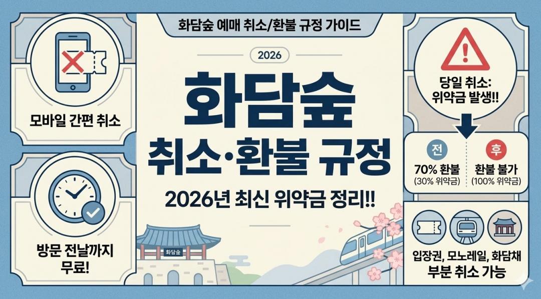 화담숲은 취소 규정이 아주 혜자로운 편이라, 전날 밤 11시 59분까지만 취소하면 수수료가 0원이에요. 덕분에 이 시간에 취소표가 가장 많이 풀리기도 하죠. 하지만 당일이 되는 순간 바로 30%를 떼어가고, 입장 시간이 지나면 단 1원도 돌려받지 못하니 시간 엄수는 필수입니다.