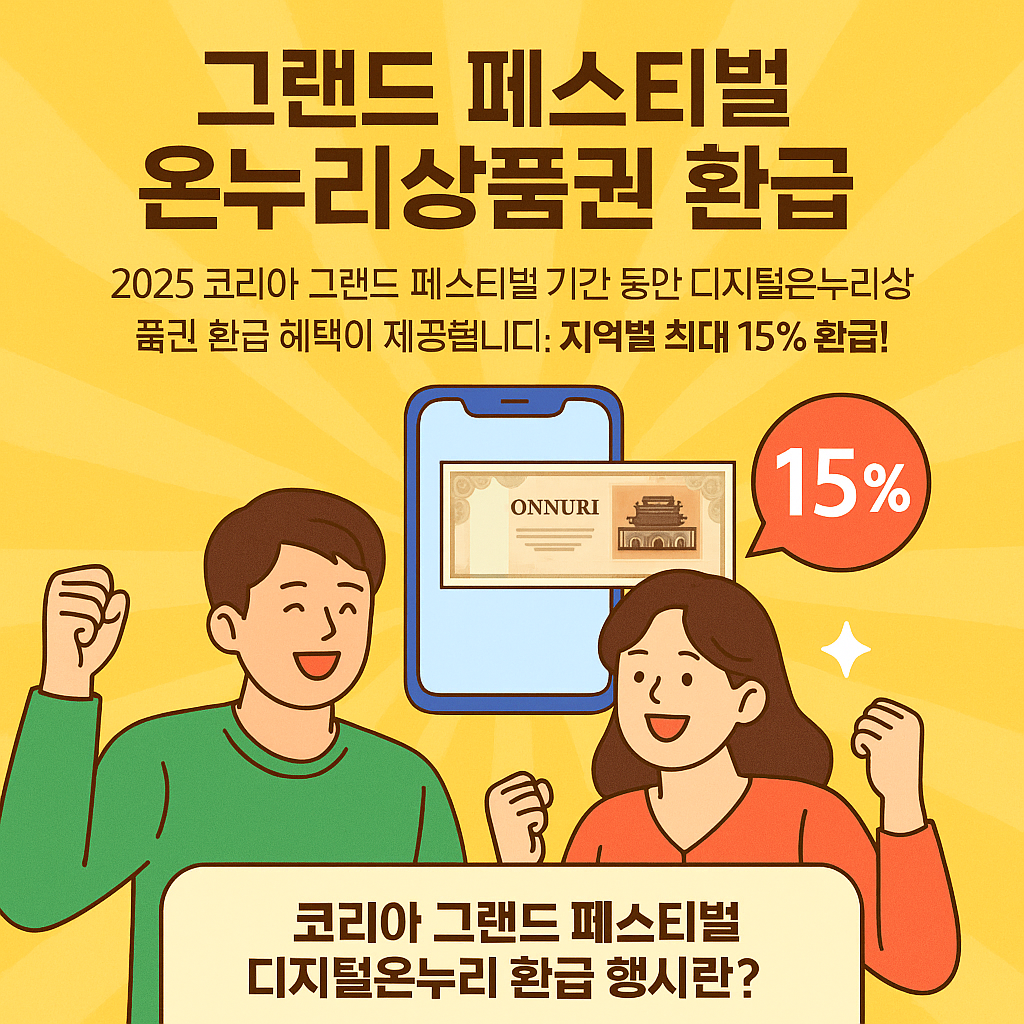 2025 코리아 그랜드 페스티벌 기간(10월 29일~11월 9일) 동안 디지털온누리상품권 결제 시 최대 15% 환급 혜택을 드립니다.