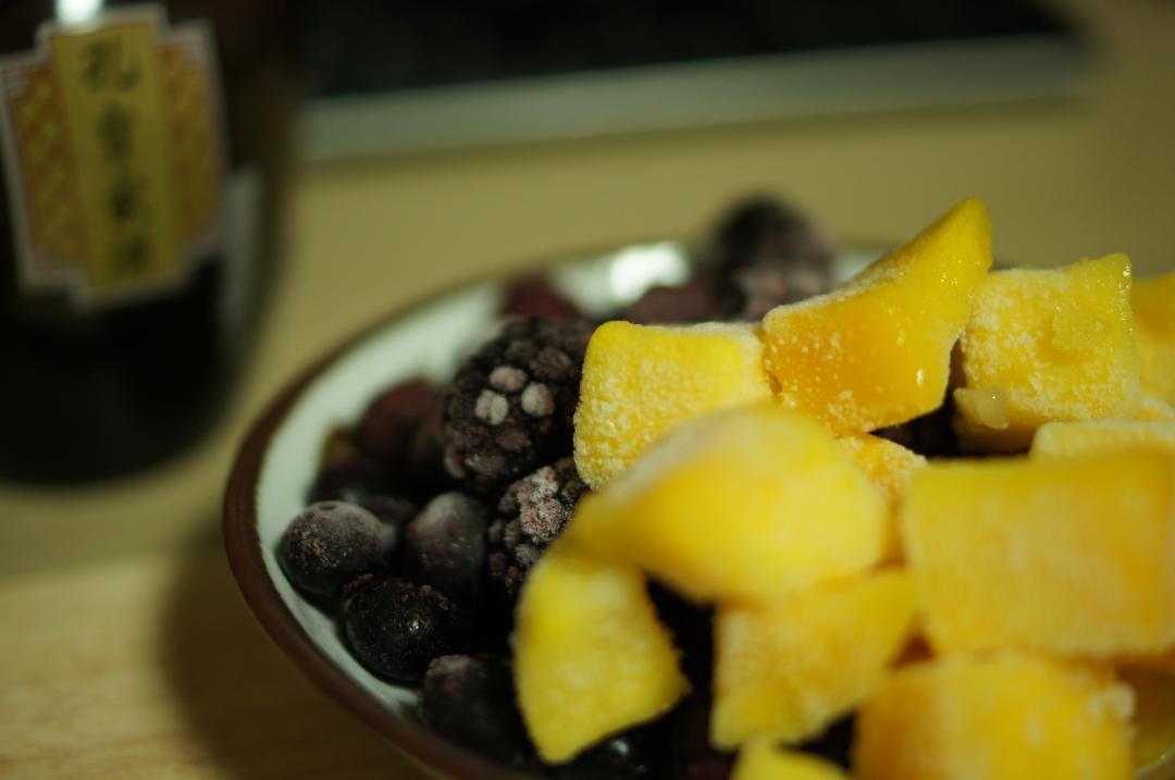 안주는 새우딤섬, 새우볼 튀김, 냉동 애플망고 & 블루베리, 블랙베리,