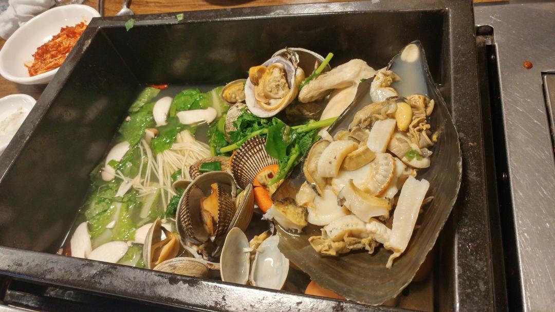 어제 친구들과 먹은 조개찜입니다 조개 밑에 닭한마리가 숨어있어요 다먹고나면 면넣어서 호로록! 소짜인데 3명이서 먹었습니다