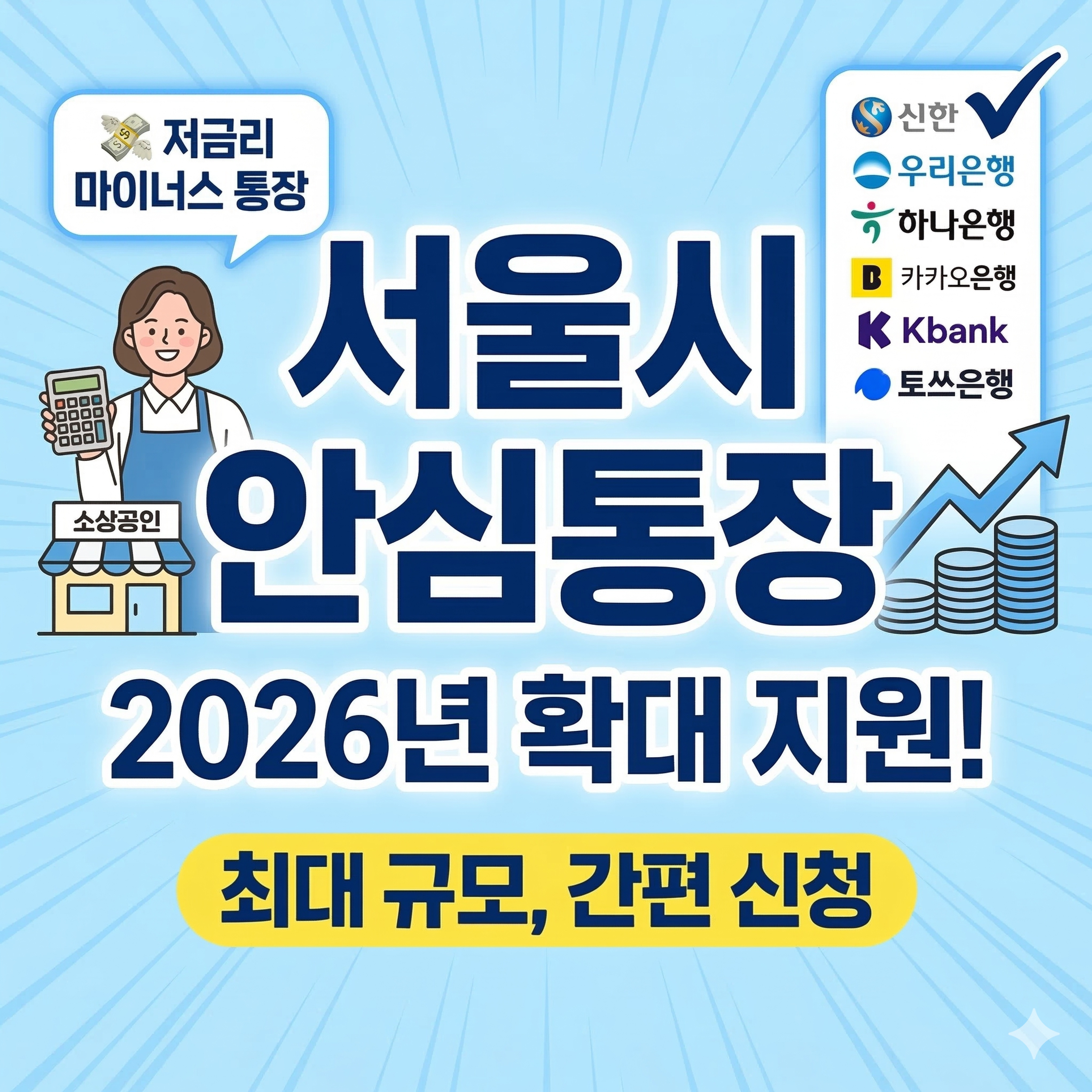 자금이 막혀 하루하루 버티기 힘든 소상공인이라면 지금 이 제도를 반드시 확인해야 합니다. 서울시가 최대 수천만원까지 활용 가능한 ‘자영업자 안심통장’을 다시 확대하면서 신청 경쟁이 매우 치열해질 전망입니다. 신청 조건과 일정, 실제 활용 방법까지 지금 바로 확인해 보세요. 안심통장 바로 신청하기 서울 자영업자 안심통장이란 서울시 안심통장은 자영업자와 소상공인의 자금 부담을 줄이기 위해 만든 금융지원 제도입니다. 일반 대출과 달리 ‘마이너스 통장’ 방식으로 운영되어 필요한 만큼만 사용하고 사용한 기간만큼만 이자를 부담하는 구조가 특징입니다. 자금 회전이 빠른 자영업자에게 특히 유리한 정책 금융 상품입니다. 서울시는 2026년에도 대규모 지원을 이어가며 약 5,000억 원 규모의 자금을 공급할 계획입니다. 그중 상반기에 약 2,000억 원이 먼저 공급되며 약 2만 명의 소상공인이 혜택을 받을 것으로 예상됩니다. 서울시 안심통장 신청 2026년 달라진 지원 혜택 올해 가장 큰 변화는 이용 편의성과 접근성이 크게 높아졌다는 점입니다. 기존에는 일부 은행만 이용할 수 있었지만 이제는 인터넷은행까지 포함되어 다양한 금융기관을 통해 신청할 수 있습니다. 구분 내용 지원 방식 마이너스 통장 방식 운영 예상 금리 약 연 4%대 수준 지원 규모 총 5,000억 원 상반기 공급 약 2,000억 원 협력 은행 신한, 우리, 하나, 카카오뱅크, 케이뱅크, 토스뱅크 특히 카드론이나 고금리 대출을 이용하던 소상공인에게는 큰 도움이 됩니다. 일반 카드론 금리가 14% 이상인 경우가 많은 반면 안심통장은 훨씬 낮은 금리로 이용 가능하기 때문입니다. 안심통장 바로 신청하기 신청 자격 조건 정리 지원 대상은 서울시에 사업장을 둔 소상공인 또는 중소기업 사업자입니다. 일정한 매출 실적과 신용 기준을 충족해야 하며 사업 운영 기간도 중요한 조건 중 하나입니다. 조건 세부 기준 사업장 위치 서울시 소재 사업장 업력 개업 후 1년 이상 매출 기준 최근 3개월 200만원 이상 또는 연 매출 1,000만원 이상 신용 점수 NICE 기준 600점 이상 청년 사업자의 경우 일부 조건이 완화될 수 있습니다. 특히 만 39세 이하 청년 사업자는 기존 대출이 있어도 지원이 가능한 경우가 있어 보다 넓은 지원이 이루어질 예정입니다. 서울시 안심통장 신청 신청 일정과 5부제 일정 신청 초기에는 접속 폭주를 방지하기 위해 출생연도 끝자리 기준 5부제가 운영됩니다. 이후에는 제한 없이 신청이 가능하지만 예산이 빠르게 소진될 수 있어 빠른 신청이 중요합니다. 신청일 출생연도 끝자리 3월 19일 1, 6 3월 20일 2, 7 3월 23일 3, 8 3월 24일 4, 9 3월 25일 5, 0 3월 26일 이후 누구나 신청 가능 신청은 서울신용보증재단 모바일 앱을 통해 진행됩니다. 사업장 위치에서 직접 사진을 촬영해야 하는 절차가 있어 미리 준비해 두는 것이 좋습니다. 신청 전 준비해야 할 것 신청 과정은 대부분 비대면으로 진행되지만 몇 가지 준비물이 필요합니다. 서류 준비가 미리 되어 있어야 심사가 빠르게 진행됩니다. 준비 항목 내용 임대차 계약서 사업장 또는 거주지 계약서 사진 사업장 사진 내부 및 외부 촬영 모바일 앱 서울신용보증재단 앱 설치 65세 이상 고령자나 모바일 사용이 어려운 경우에는 서울신용보증재단 영업점을 방문해 대면 신청도 가능합니다. 실제로 지난해 지원금은 약 47일 만에 조기 소진될 정도로 인기가 높았습니다. 마무리 정리 서울시 자영업자 안심통장은 소상공인의 금융 부담을 줄이기 위해 만들어진 대표적인 정책 금융입니다. 낮은 금리와 마이너스 통장 방식 덕분에 자금 유동성이 필요한 자영업자에게 실질적인 도움이 됩니다. 특히 올해는 협력 은행 확대와 청년 사업자 기준 완화 등으로 더 많은 사업자가 혜택을 받을 수 있게 되었습니다. 자금이 필요한 소상공인이라면 신청 일정 전에 서류와 준비사항을 미리 확인하는 것이 중요합니다. Q&A Q1. 서울 안심통장은 최대 얼마까지 이용할 수 있나요? 사업자 신용도와 보증 심사 결과에 따라 한도가 결정됩니다. 일반적으로 수천만 원 수준의 마이너스 통장 한도가 제공됩니다. Q2. 기존 대출이 있어도 신청 가능한가요? 일정 수준의 대출은 있어도 신청이 가능합니다. 다만 보증 잔액이 과도하게 많거나 금융 이용 상태가 좋지 않으면 제한될 수 있습니다. Q3. 신청 후 승인까지 얼마나 걸리나요? 비대면 자동 심사 시스템을 통해 빠르면 영업일 기준 하루 이내 승인되는 경우도 있습니다. Q4. 중도 상환 수수료가 있나요? 마이너스 통장 방식이기 때문에 사용한 금액만 이자가 발생하며 여유 자금이 생기면 언제든 자유롭게 상환할 수 있습니다. Q5. 신청은 어디서 하나요? 서울신용보증재단 모바일 앱을 통해 신청할 수 있으며 일부 대상자는 재단 영업점 방문 신청도 가능합니다. 2026 서울시 안심통장 지금 바로 신청하기