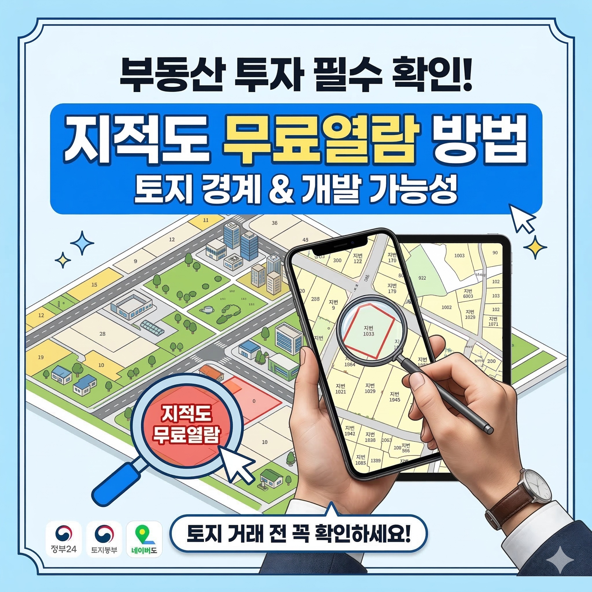 토지 거래나 부동산 투자 전에 반드시 확인해야 하는 정보가 있습니다. 바로 지적도 열람입니다. 많은 사람들이 모르고 지나치지만, 지적도 하나만 제대로 확인해도 토지 경계와 개발 가능성까지 미리 파악할 수 있습니다. 아래 버튼을 눌러 지적도 무료열람 방법과 꼭 알아야 할 핵심 정보를 지금 바로 확인해보세요. 지적도 무료열람 바로가기 지적도란 무엇인가 지적도는 토지의 위치, 경계, 지번, 지목, 면적 등을 확인할 수 있는 지도 형태의 자료입니다. 부동산 거래나 토지 이용 계획을 세울 때 가장 기본적으로 확인해야 하는 자료로, 토지의 정확한 형태와 주변 토지와의 경계를 확인하는 데 사용됩니다. 국토 관리와 토지 권리 관계를 파악하는 중요한 기초 자료이기도 합니다. 특히 토지를 매매하거나 건축 계획을 세우는 경우라면 지적도를 먼저 확인하는 것이 매우 중요합니다. 지도 형태로 제공되기 때문에 토지의 모양과 주변 환경을 직관적으로 파악할 수 있으며, 지번과 토지 경계 정보를 통해 해당 부지의 기본적인 특성을 확인할 수 있습니다. 지적도 무료열람 바로가기 지적도 무료열람 방법 지적도는 인터넷을 통해 누구나 간단하게 열람할 수 있습니다. 대표적인 방법은 정부24 서비스 또는 국토교통부에서 제공하는 토지이용규제정보서비스를 이용하는 것입니다. 주소나 지번만 입력하면 해당 토지의 지적도를 지도 형태로 확인할 수 있습니다. 특히 인터넷 열람의 경우 대부분 무료로 이용할 수 있으며, 단순 조회는 비용이 발생하지 않습니다. 다만 공식 문서로 발급하거나 출력하는 경우에는 소액의 수수료가 발생할 수 있습니다. 구분 내용 신청방법 인터넷, 방문, 전화, 우편 신청자격 누구나 신청 가능 처리기간 즉시 처리 (근무시간 기준 약 3시간 이내) 수수료 열람 400원 / 등본 700원 / 인터넷 열람 무료 정부24 기준으로 지적도 등본 발급 및 열람은 누구나 신청할 수 있으며 인터넷을 통한 열람은 무료로 제공되는 경우가 많습니다. 따라서 간단한 토지 확인 목적이라면 온라인 열람만으로도 충분히 필요한 정보를 확인할 수 있습니다. 지적도 무료열람 바로가기 토지이용규제정보서비스 활용 지적도를 확인할 때 많은 사람들이 활용하는 서비스가 바로 토지이용규제정보서비스입니다. 이 서비스에서는 단순한 지적도뿐만 아니라 해당 토지에 적용되는 각종 규제와 도시계획 정보까지 함께 확인할 수 있습니다. 예를 들어 건폐율, 용적률, 건축 높이 제한, 도로 계획, 개발 예정 지역 등의 정보를 한 번에 확인할 수 있어 토지 투자나 건축 계획을 세울 때 매우 유용합니다. 특히 주소 검색 또는 지도 클릭만으로 간편하게 조회가 가능해 초보자도 쉽게 이용할 수 있습니다. 또한 위성지도와 일반 지도를 함께 확인할 수 있어 실제 주변 환경과 토지 경계를 동시에 비교해볼 수 있다는 장점이 있습니다. 지적도 무료열람 바로가기 네이버 지도 지적편집도 활용법 지적도 정보를 간단하게 확인하는 방법 중 하나가 네이버 지도 지적편집도 기능을 사용하는 것입니다. 일반 지도 화면에서 지적편집도를 켜면 토지 경계와 지번, 도시계획 구역 등을 한눈에 확인할 수 있습니다. 특히 부동산 투자자들이 많이 활용하는 이유는 현재 토지 정보뿐 아니라 향후 개발 계획까지 함께 확인할 수 있기 때문입니다. 예를 들어 예정 도로나 개발 계획이 지도에 표시되기 때문에 향후 지역 변화 가능성을 미리 파악할 수 있습니다. 실제로 겉으로는 조용해 보이는 지역이라도 지적편집도를 통해 도로 예정지나 개발 구역이 확인되는 경우가 있어 계약 전 확인하는 습관이 중요합니다. 지적도 확인 시 주의사항 지적도는 토지 정보를 파악하는 데 매우 유용하지만 참고용 자료라는 점을 반드시 기억해야 합니다. 지도 데이터와 실제 측량 결과 사이에는 차이가 발생할 수 있기 때문입니다. 따라서 토지 경계 분쟁이나 건축 설계처럼 정확한 경계 확인이 필요한 경우에는 전문 측량을 진행해야 합니다. 또한 토지 이용 허가나 개발 관련 인허가를 신청할 때는 반드시 관계 기관을 통해 공식 확인 절차를 거치는 것이 좋습니다. 지적도는 어디까지나 기본적인 정보를 확인하는 단계이며, 실제 행정 절차에서는 추가 확인이 필요할 수 있습니다. 지적도 활용이 중요한 이유 부동산 거래에서 가장 위험한 상황 중 하나는 정확한 토지 정보를 확인하지 않고 계약을 진행하는 것입니다. 지적도를 확인하면 토지 모양, 경계, 주변 토지 상황을 쉽게 파악할 수 있기 때문에 이러한 위험을 크게 줄일 수 있습니다. 특히 토지 투자나 개발 계획이 있는 경우라면 지적도와 토지이용규제 정보를 함께 확인하는 것이 중요합니다. 단 몇 분의 확인만으로도 향후 개발 가능성이나 규제 여부를 미리 파악할 수 있기 때문입니다. 부동산 거래 경험이 많지 않은 분들도 인터넷 지적도 열람 서비스를 활용하면 기본적인 토지 정보를 쉽게 확인할 수 있습니다. Q&A Q. 지적도 열람은 무료인가요? 인터넷을 통한 단순 열람은 대부분 무료로 이용할 수 있습니다. 다만 공식 문서 형태로 등본 발급이나 출력이 필요한 경우에는 소액의 수수료가 발생할 