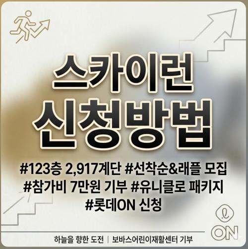 1층부터 123층까지 총 2,917개의 계단을 오르는 이번 대회는 선착순 및 래플(추첨) 방식으로 모집하며, 신청은 오직 롯데ON 앱을 통해 가능합니다. 참가비는 70,000원으로 전액 어린이 재활센터에 기부되는 뜻깊은 행사입니다. 참가자에게는 유니클로 기능성 티셔츠, 스포츠 삭스 등이 포함된 레이스 키트가 제공되며, 완주 시 메달과 디지털 기록증이 수여됩니다. 40세 이상 참가자는 당일 현장 검진이 필수인 만큼 철저한 안전 관리 속에 진행됩니다.​