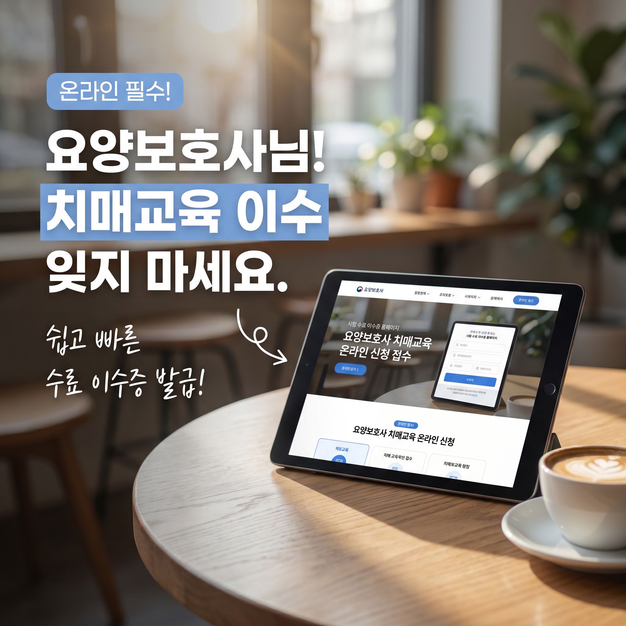 요양보호사로서 전문성을 높이고 안정적인 업무 수행을 위해 치매교육은 필수 과정입니다. 온라인 신청부터 접수, 시험, 수료까지 한 번에 진행할 수 있으니 공식 홈페이지를 통해 빠르게 준비해보시길 바랍니다.