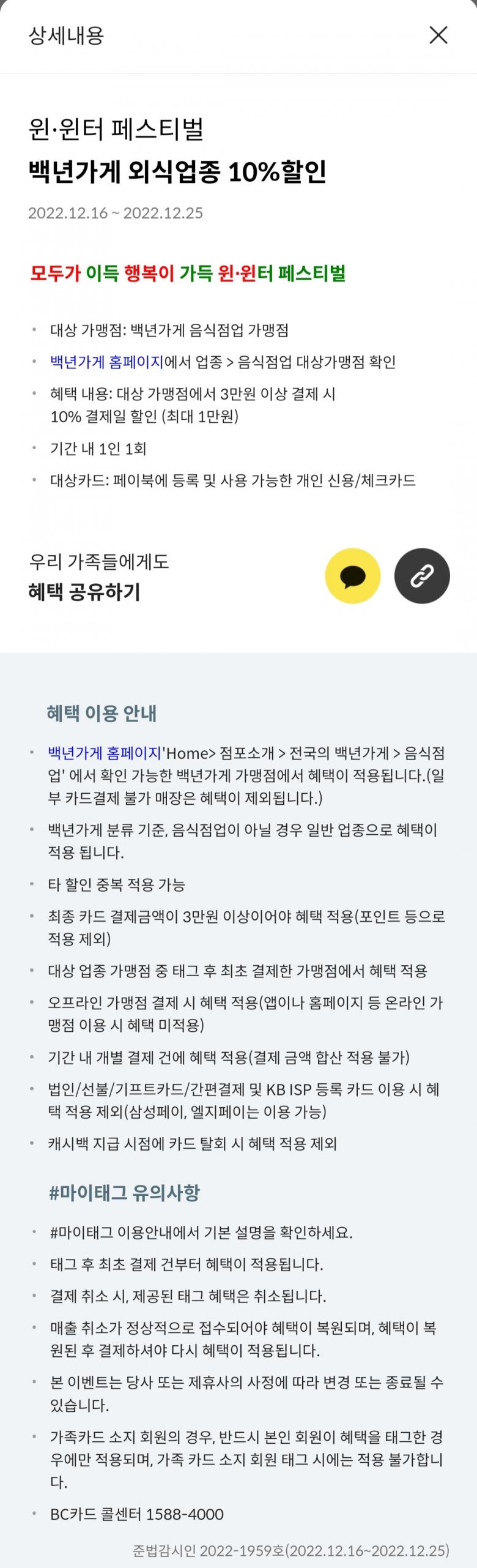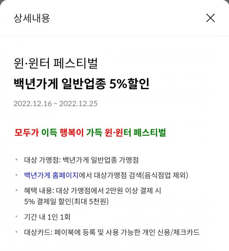 윈*윈터 페스티벌 백년가게는 크리스마스 기념으로 나온 혜택인데 음식점은 10%, 그 외 업종은 5% 청구할인을 해준다고 하네요~